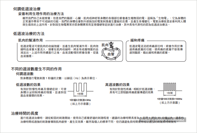 低週波治療器的原理與功能可以簡單理解成「利用低頻電流刺激肌肉與神經,達到 1) 緩解疼痛與 2) 促進血液循環的效果」。