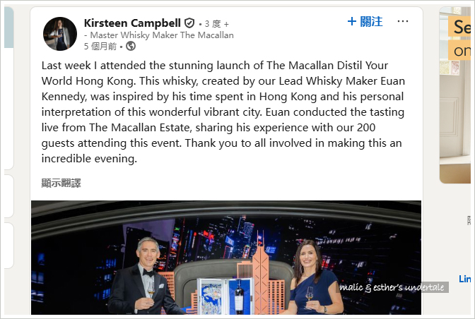 回來一查,果然是真的。看來麥卡倫最近的酒廠管理有點問題。從公開媒體資訊可以知道,麥卡倫 (The Macallan) 的首席釀酒大師應該是 Kirsteen Campbell (自 2019 年起),但 2022 年後現身在媒體前的卻是另一位首席釀酒師 Euan Kennedy。Kirsteen Campbell 的 X 帳戶貼文停留在了 2020 年 4 月,LinkedIn 兩年來只有兩則貼文,間隔了一年半。