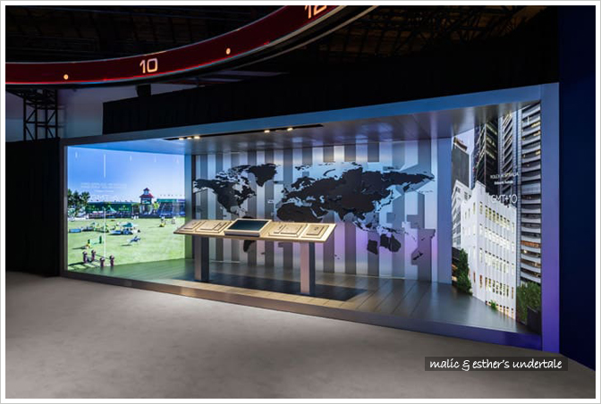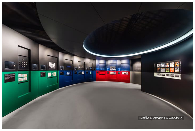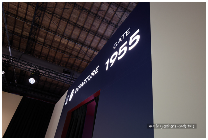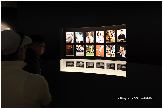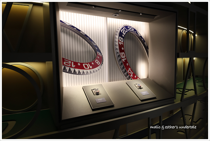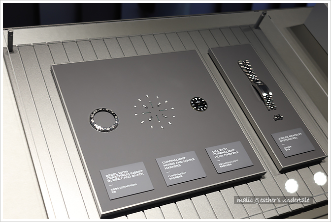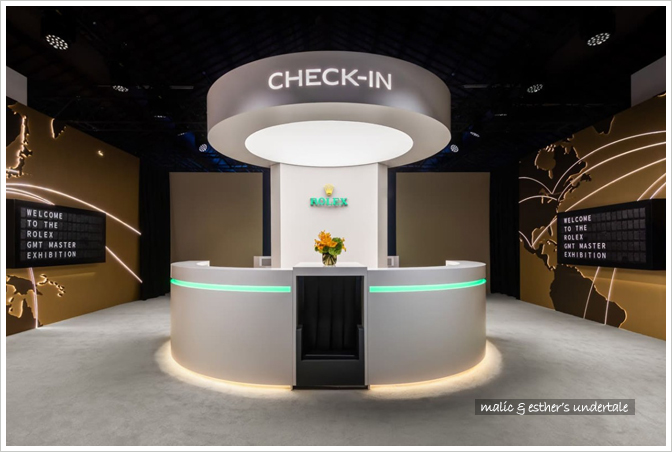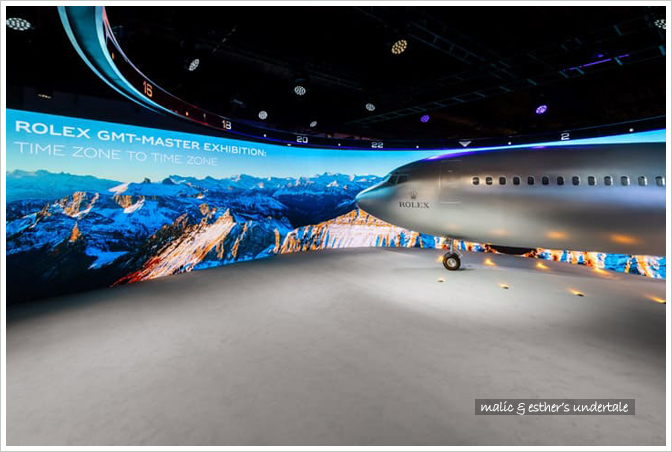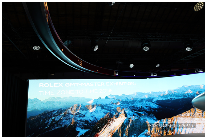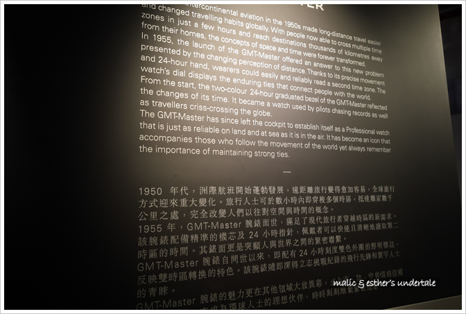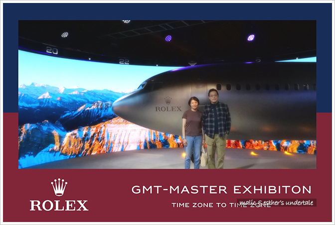 入門後,正中央是由勞力士登機櫃台。我們依循報名通知上的登機證 (QR code) 掃描進場。每組貴賓會由一位空服員打扮的解說員引導,依序參觀大型展廳的勞力士飛機、GMT-Master 的歷史、發展沿革與製造,以及提供一個巨型 GMT-Master II 和八款現行手錶供貴賓觀賞。一側的名人牆,無須多想就可以看到費德勒的身影。流程最後有一個微型電影院,可以觀賞 5-8 分鐘的 GMT-Master 簡介。沒想到,這個橋段竟成了 Esther 最滿意的一個環節。