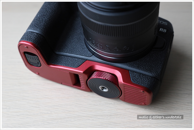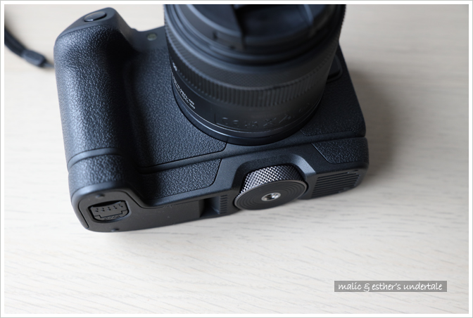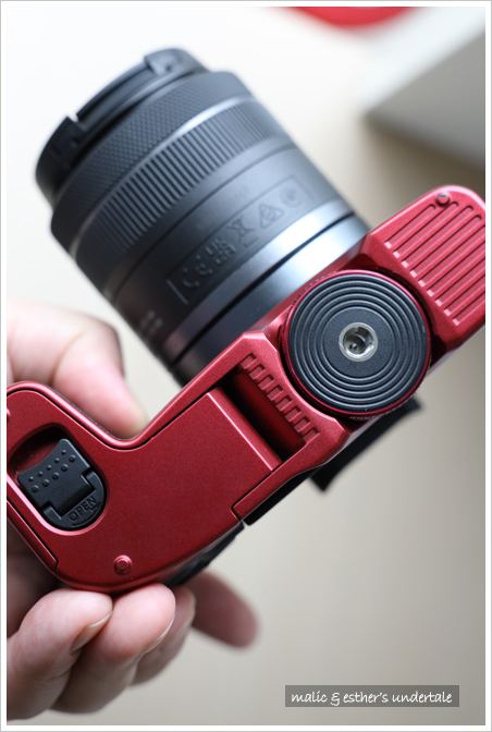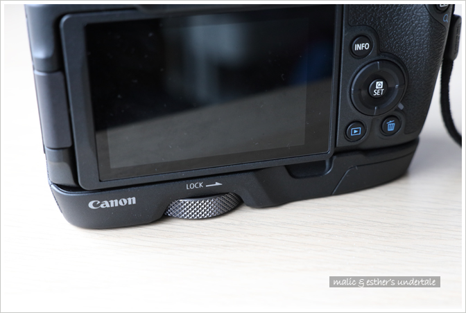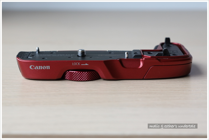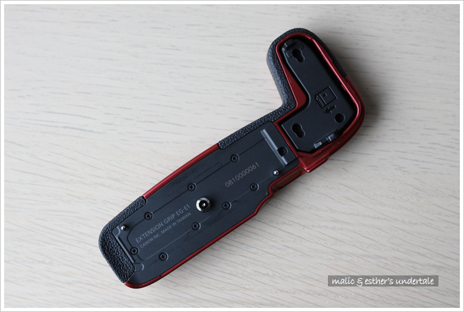 為了便於握持,Canon 提供了不帶電池倉的 EG-E1 擴展手柄,可擴展把手的握持空間 (延長約 2.3 cm)。有了 EG-E1,相機握持手感明顯提升,裝上大三元鏡頭也不會頭重腳輕。此外它是可拆卸式的,使用輕便鏡頭時隨手拆下即可。
