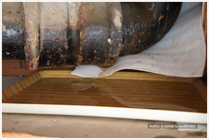 Esther 和我東翻西找,好不容易找到一個適用的小托盤接水。但托盤淺,每幾個小時就要倒水。幾天下來,Esther 已經習慣我大清早開燈,站在小梯上拿盆接水了。